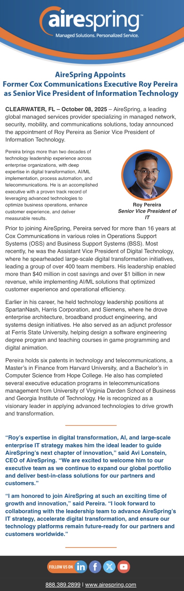AireSpring Appoints Former Cox Communications Executive Roy Pereira as Senior Vice President of Information Technology Source iAgentNetwork on 10/10/25
