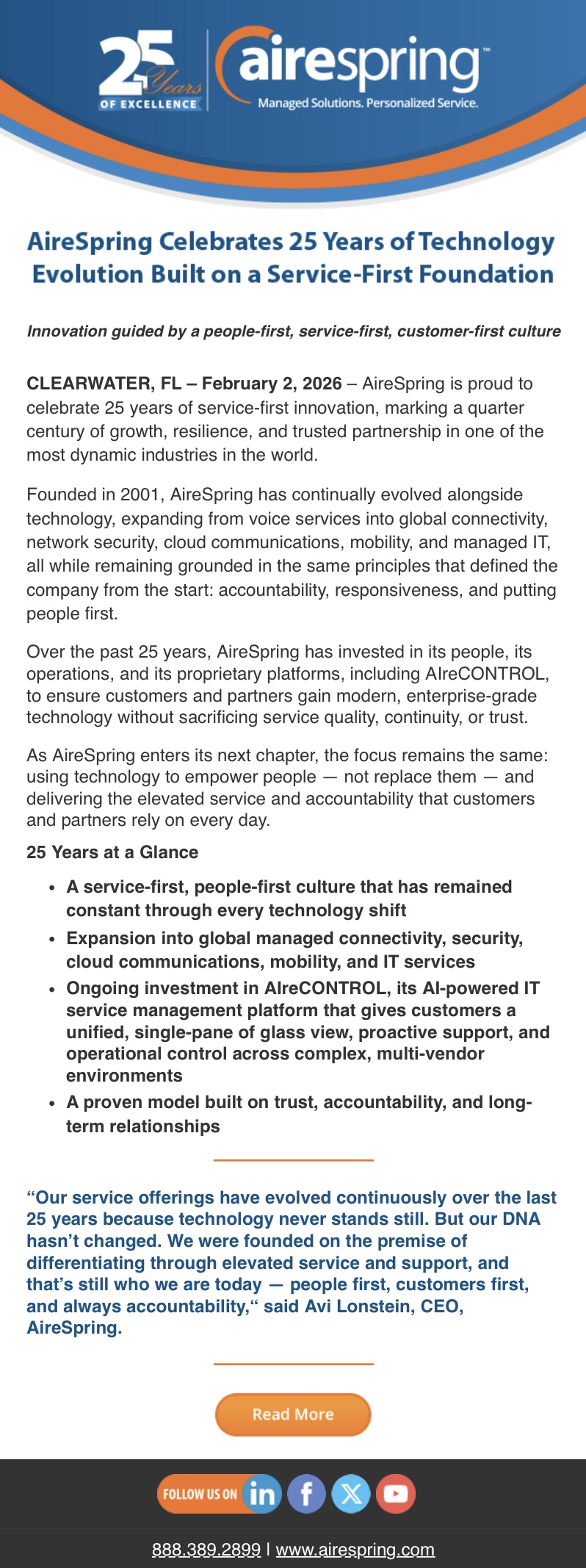 AireSpring Celebrates 25 Years of Service-First Innovation