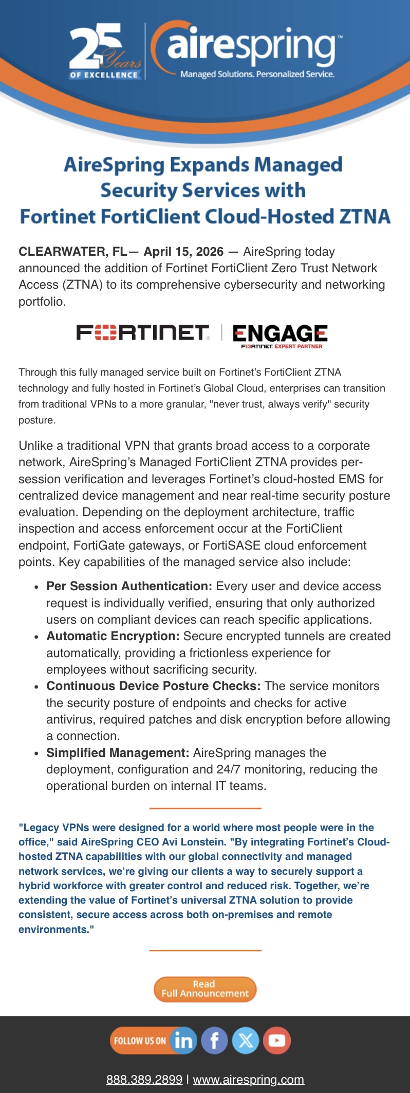 AireSpring Expands Managed Security Services with Fortinet FortiClient Cloud-Hosted ZTNA Source iAgentNetwork on 04/16/26