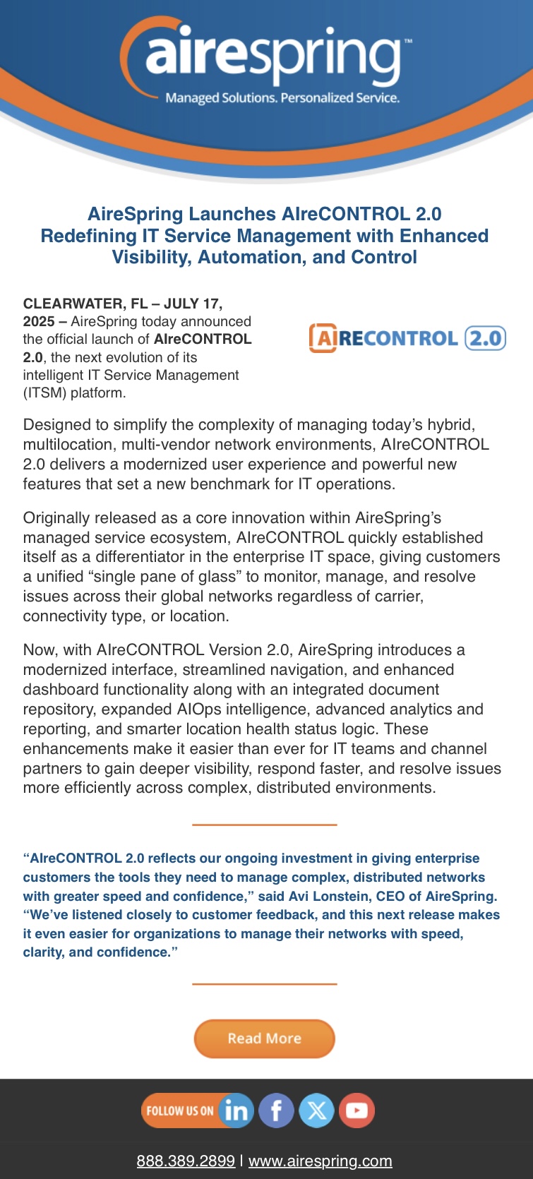 AireSpring Launches AIreCONTROL 2.0 – Redefining IT Service Management with Enhanced Visibility, Automation, and Control