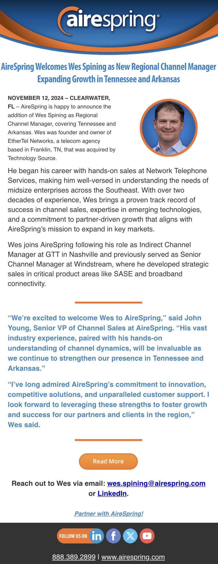 AireSpring Welcomes Wes Spining as New Regional Channel Manager Expanding Growth in Tennessee and Arkansas Source iAgentNetwork on 11/12/24