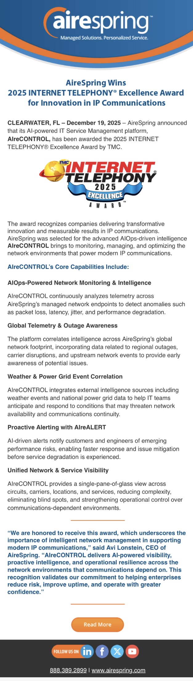 AireSpring Wins 2025 INTERNET TELEPHONY Excellence Award
