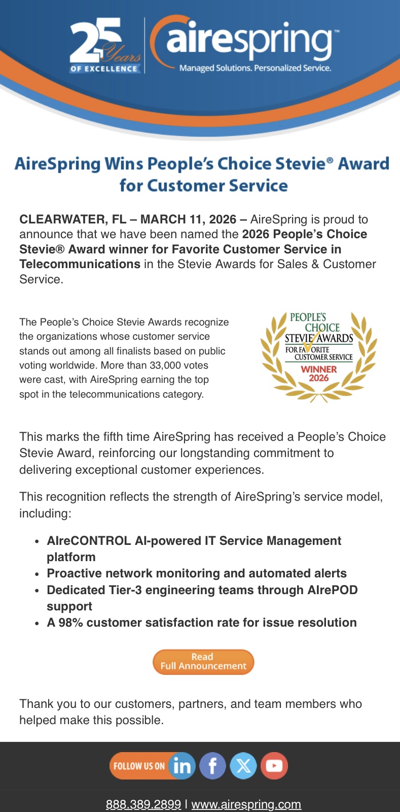 AireSpring Wins 2026 People’s Choice Stevie Award for Favorite Customer Service Source iAgentNetwork on 03/13/26