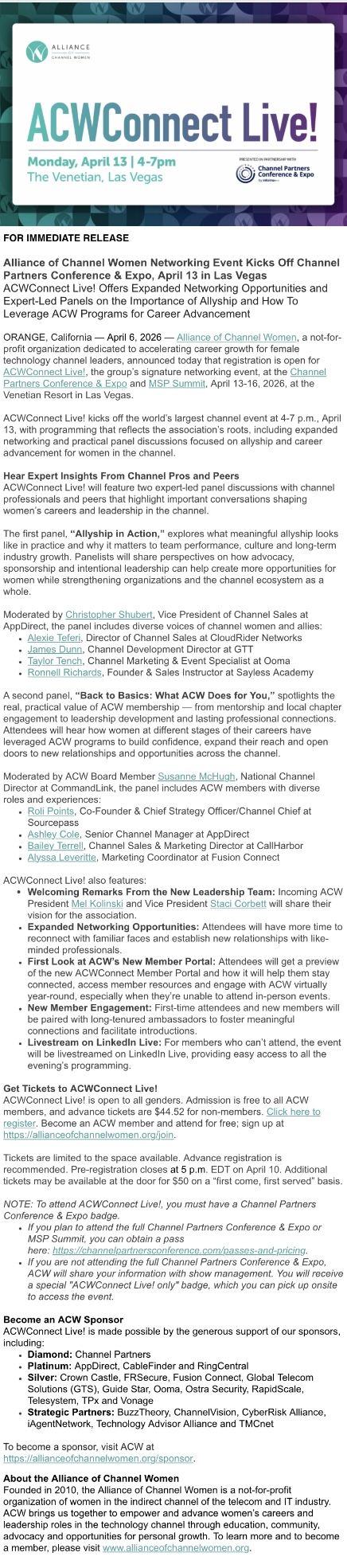 Alliance of Channel Women Networking Event Kicks Off Channel Partners Conference & Expo, April 13 in Las Vegas Source iAgentNetwork on 04/6/26