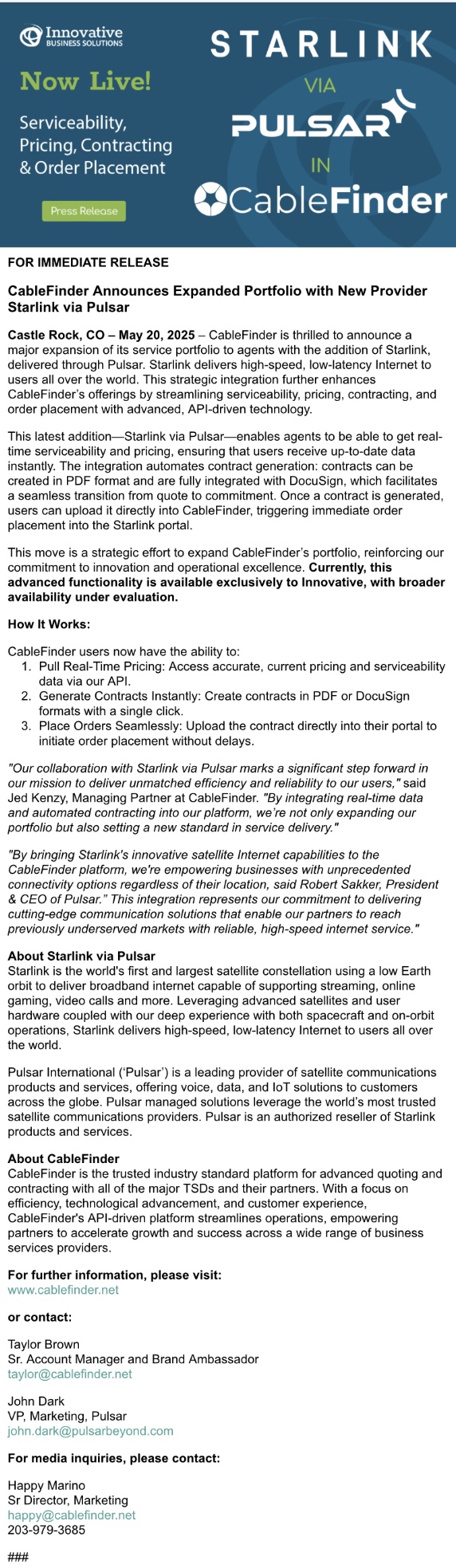 CableFinder Announces Expanded Portfolio with New Provider Starlink via Pulsar