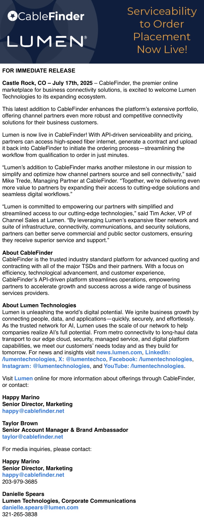 CableFinder Welcomes Lumen to its Platform, Expanding Connectivity Options for Channel Partners
