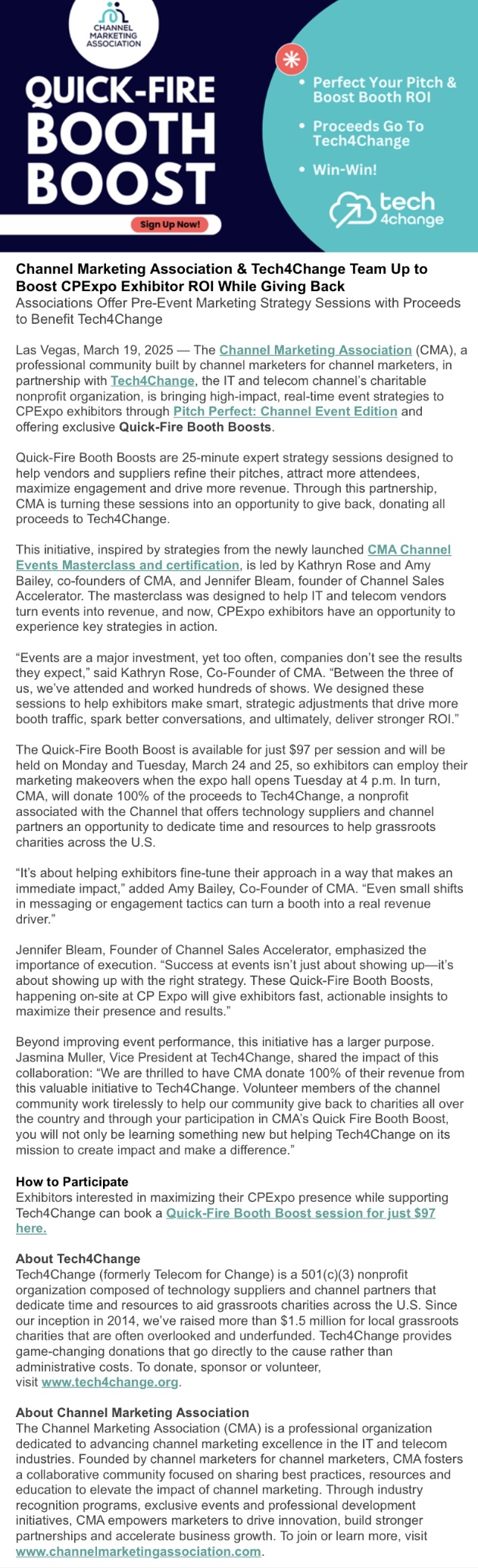 Channel Marketing Association & Tech4Change Team Up to Boost CPExpo Exhibitor ROI While Giving Back