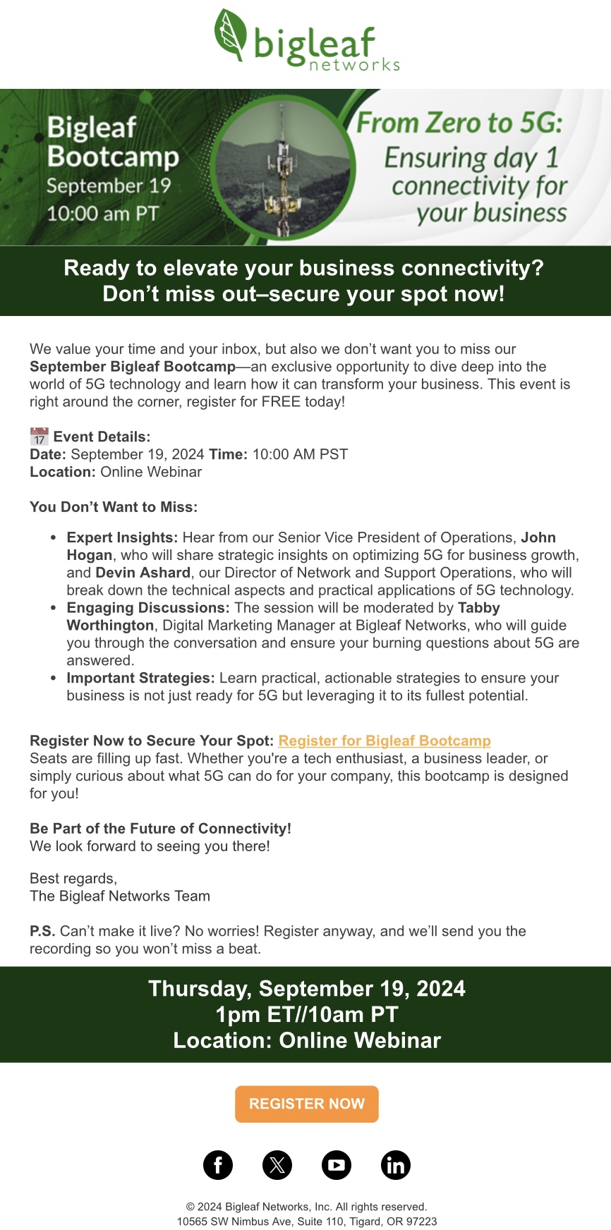Don’t Forget to Register! Unlock the Power of 5G at Bigleaf’s September Bootcamp Source iAgentNetwork on 09/18/24