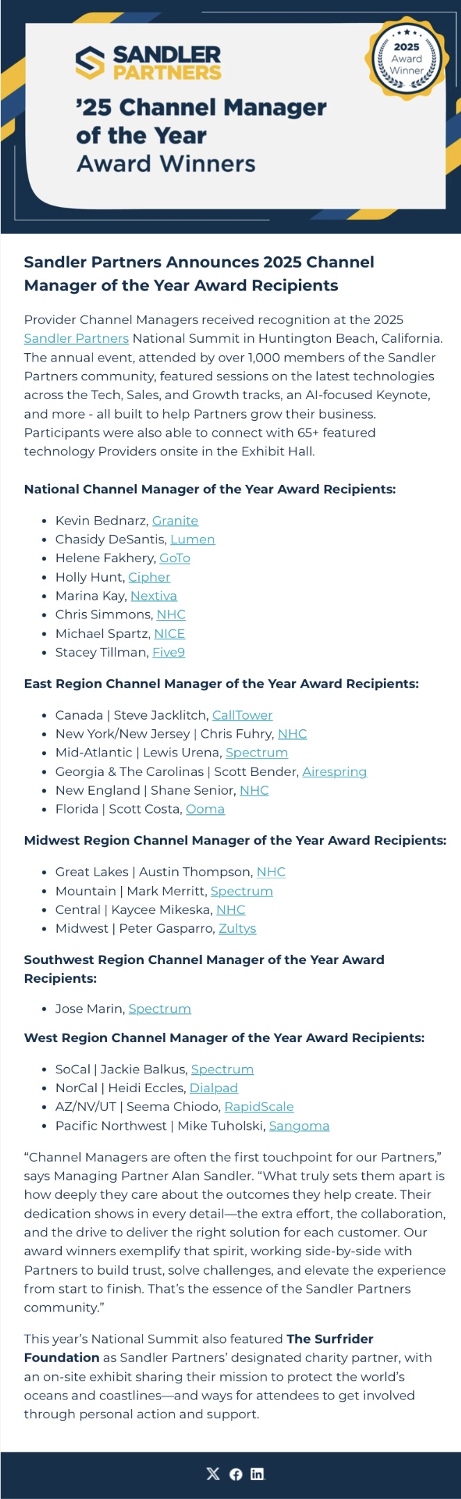 Sandler Partners Announces 2025 Channel Manager of the Year Awards Recipients Source iAgentNetwork on 10/14/25