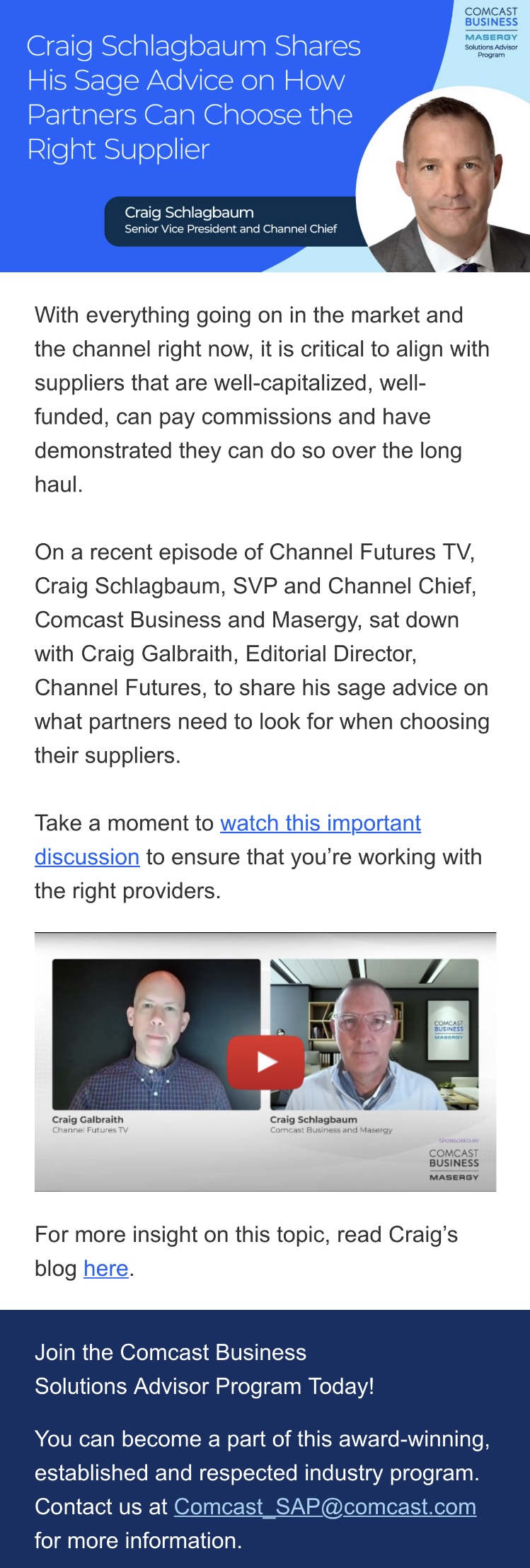 Watch: Comcast’s Craig Schlagbaum Shares His Sage Advice on How Partners Can Choose the Right Supplier Source iAgentNetwork on 03/30/23